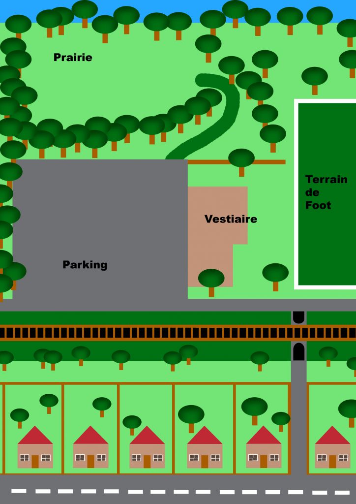 Afin d’éviter de me perdre en descriptions à rallonge, voici donc en image le décor de notre petite histoire (sur le plan on ne le voit pas mais cette prairie était entourée d’une barrière de barbelés et de ronces entrelacées. Le seul chemin pour y accéder était jalonné d’arbre et de végétation dense) :
