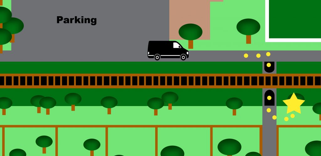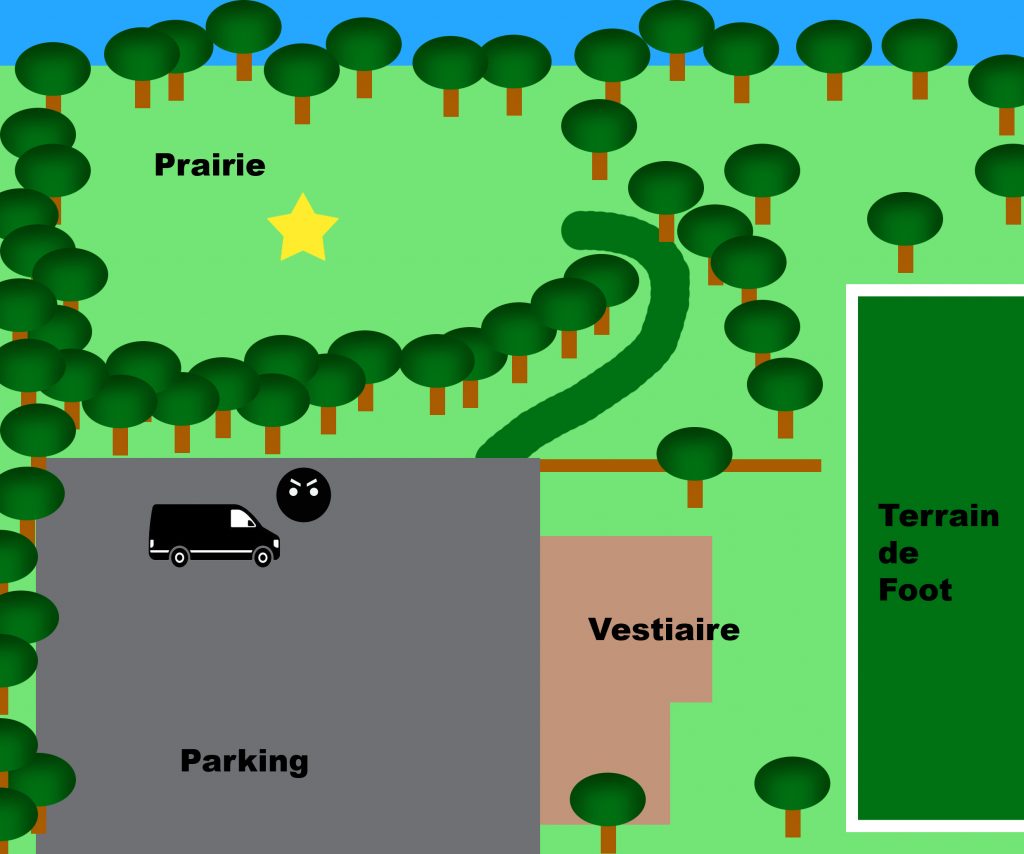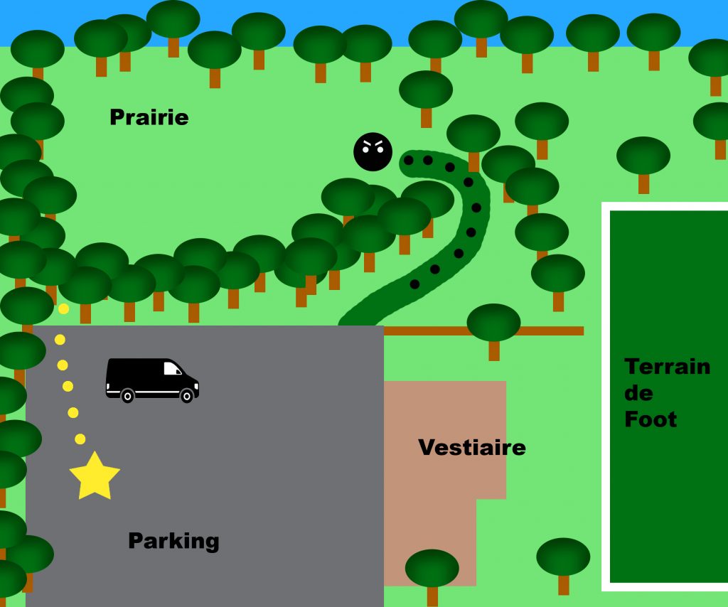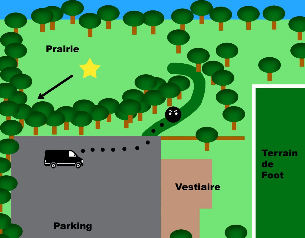 Une journée ensoleillé, alors qu’Evy (représentée par l’étoile) se trouvait dans la prairie, une camionnette s’est soudain garée sur le parking et un homme en est sorti.