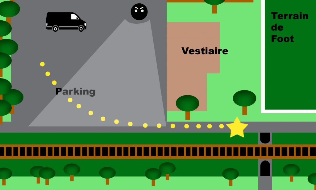 La voix lui dit alors d’avancer jusqu’au pont sans chercher à courir, en ne perdant pas une seconde et sans se retourner, ce qu’elle fit. A aucun moment elle n’a été physiquement en mesure de courir. Ses jambes étaient raides car contenir l’explosion de sa terreur lui demandait toutes ses forces. Avec le recul, je pense que si elle avait couru, l’homme aurait entendu le bruit de ses pas sur le bitume et serait sans doute revenu bien plus vite sur les siens. Ce timing a fait que le bâtiment des vestiaires nous a dissimulée à sa vue, probablement quand l’homme revenait à nouveau sur le parking.